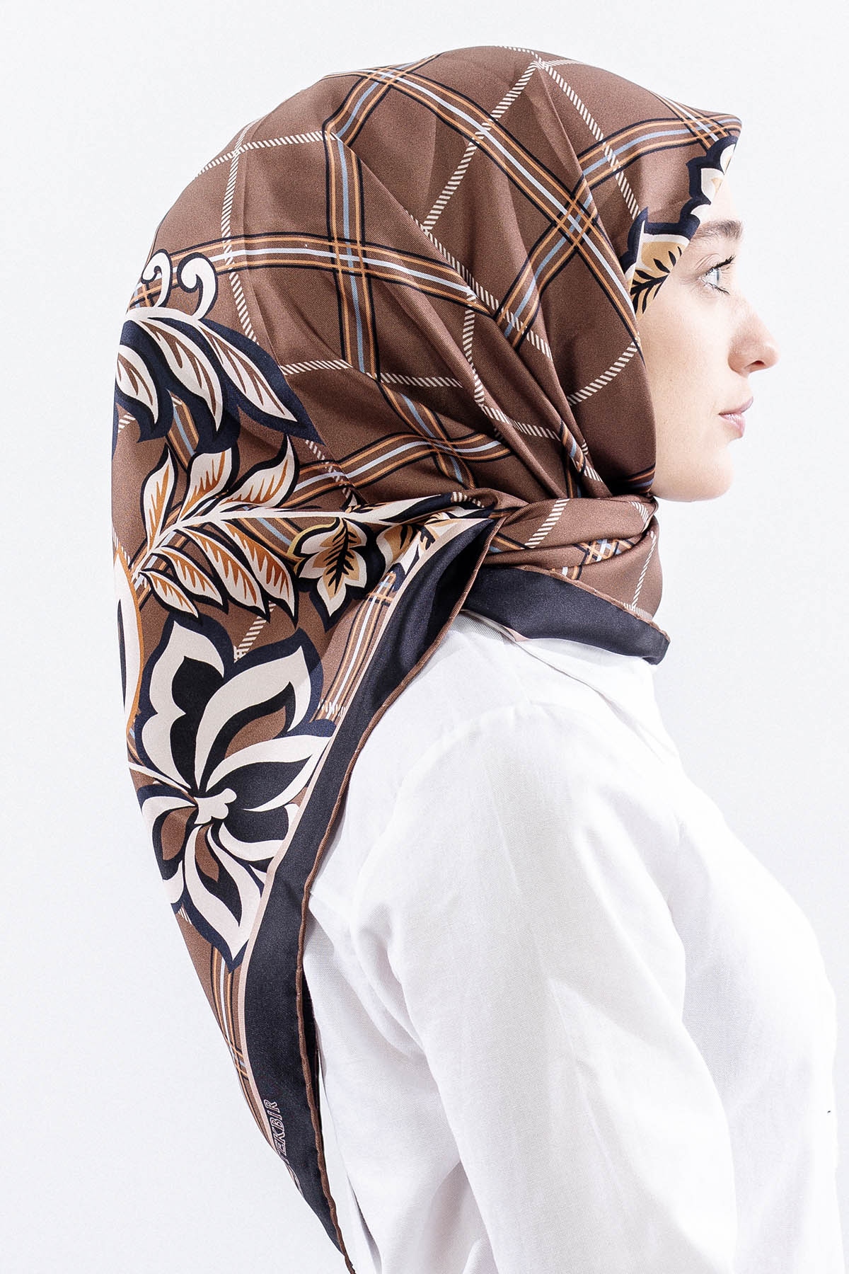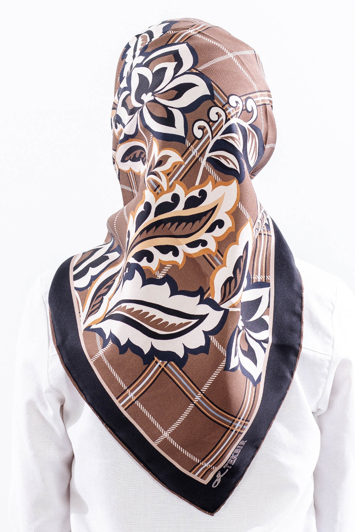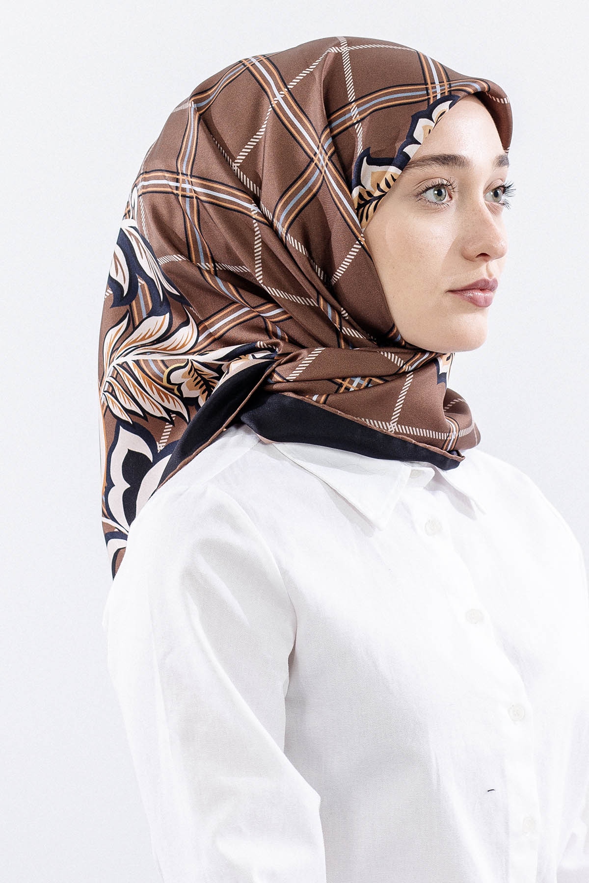 Dg14815 İpek Eşarp Kare Yaprak Tvil Kumas - Kahve - 1