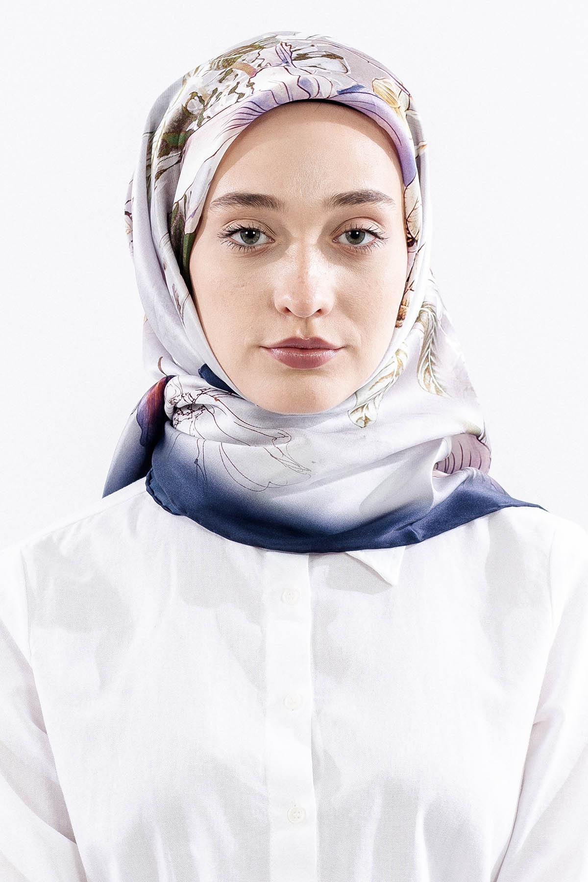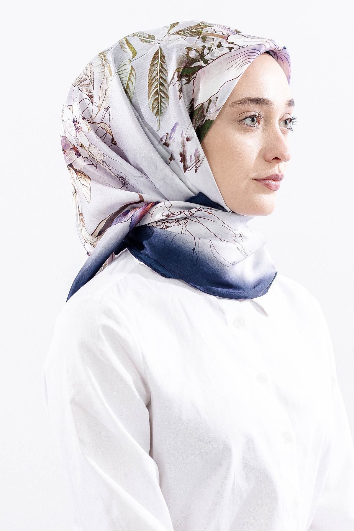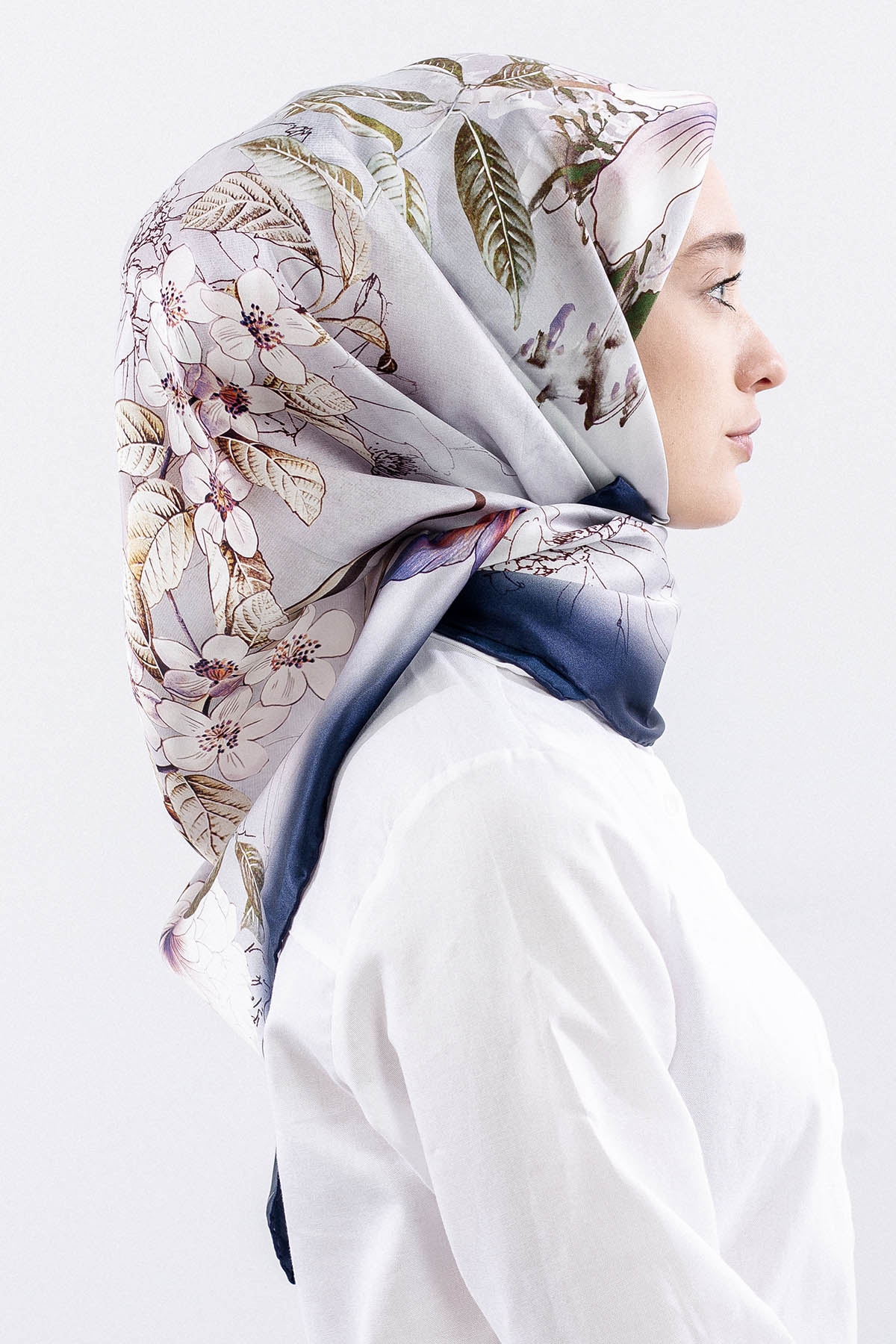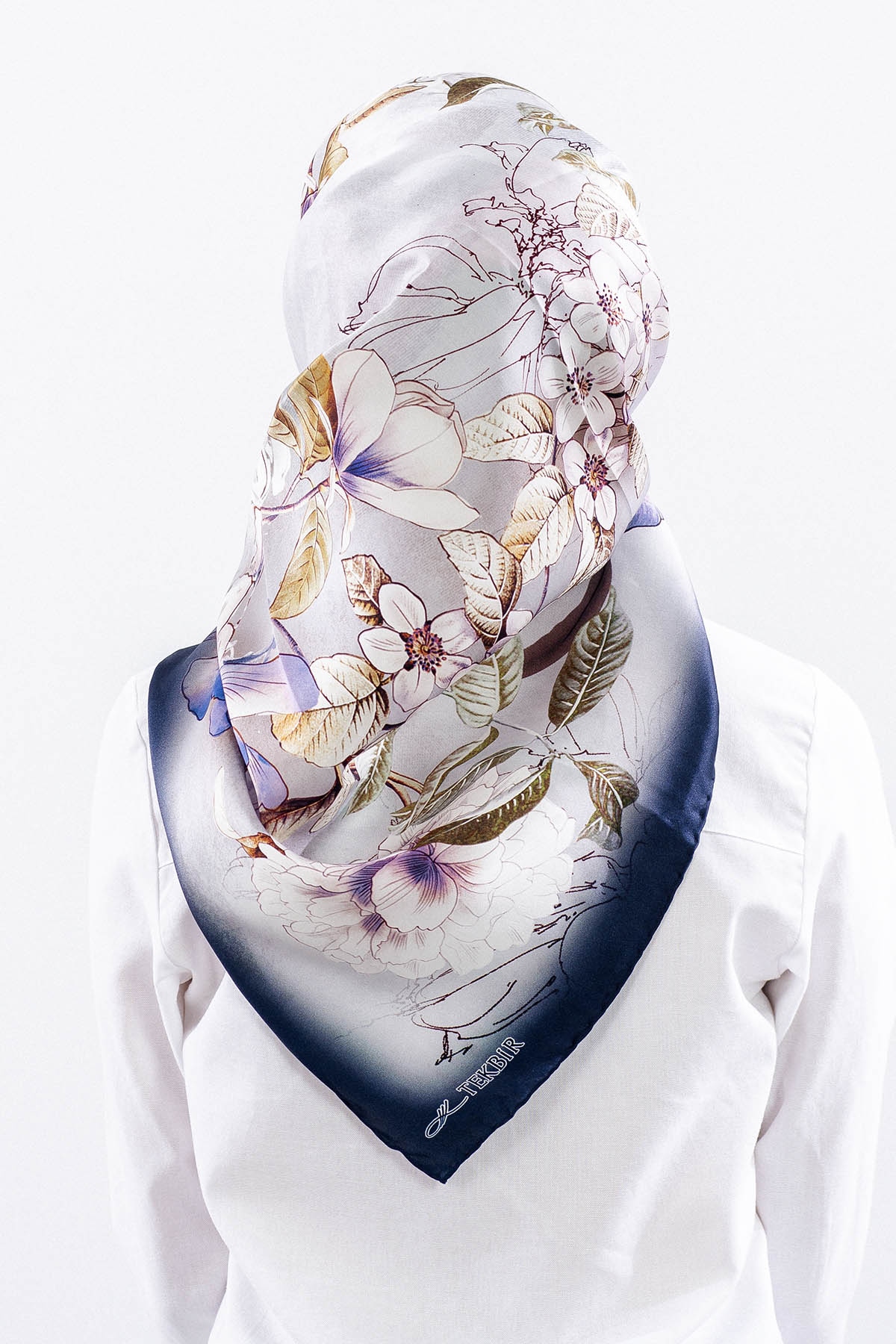 Dg14828 İpek Eşarp Cicek Dali Tvil Kumas - Ekru_lacivert - 1
