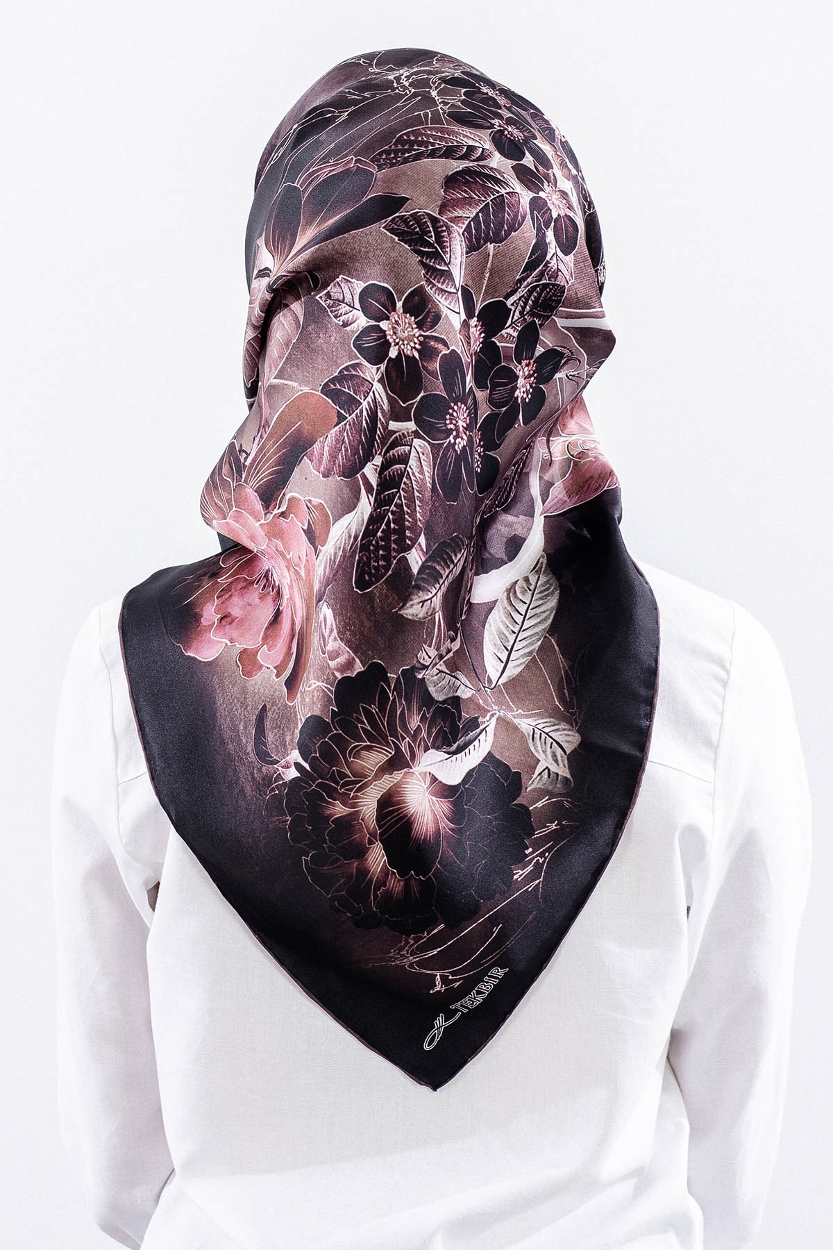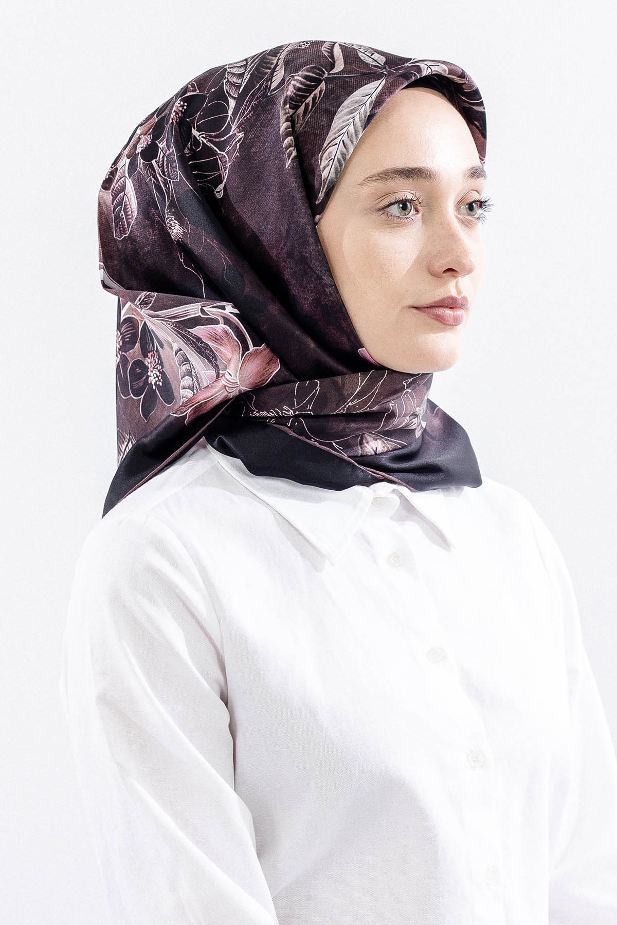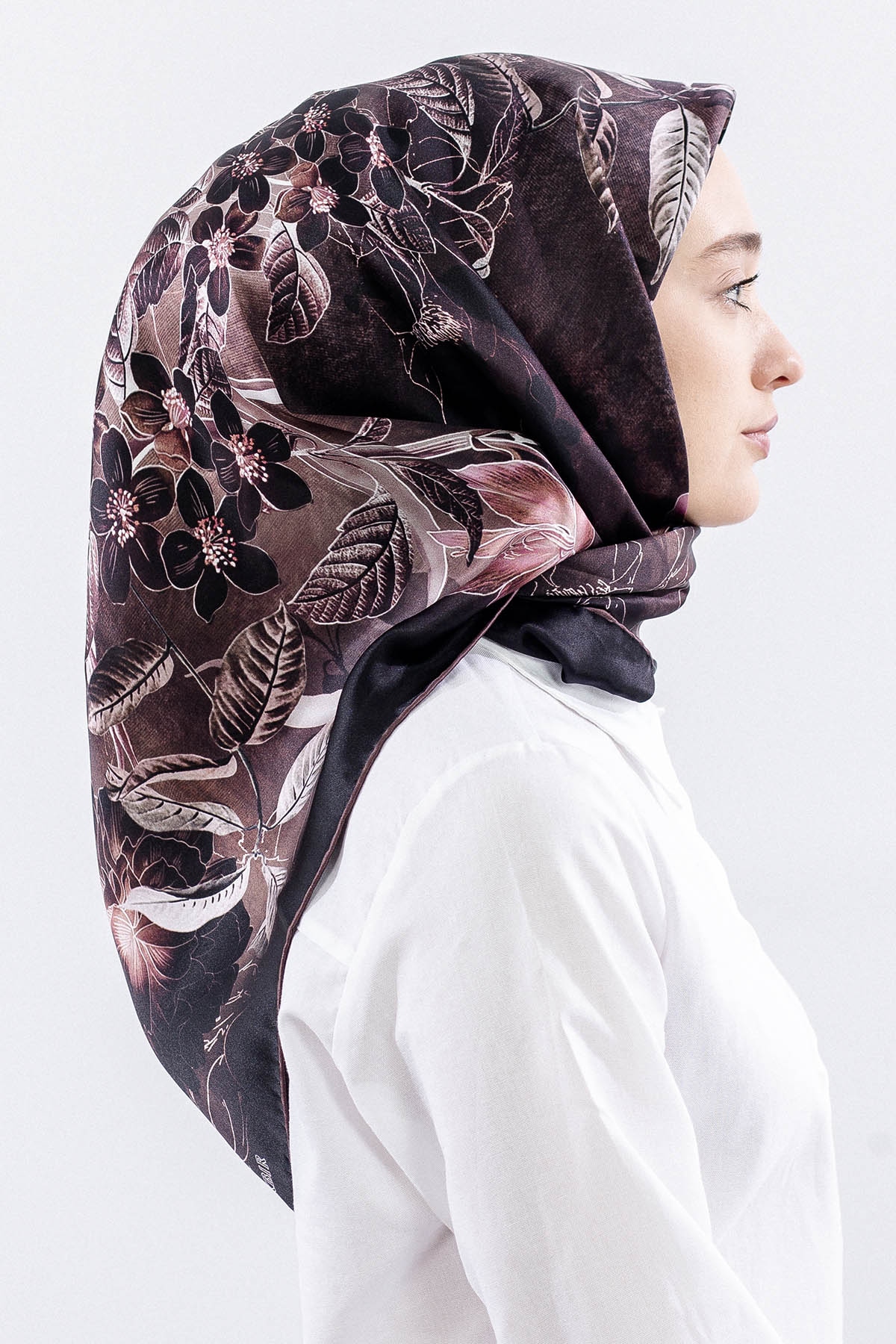 Dg14828 İpek Eşarp Cicek Dali Tvil Kumas - Kahve - 1