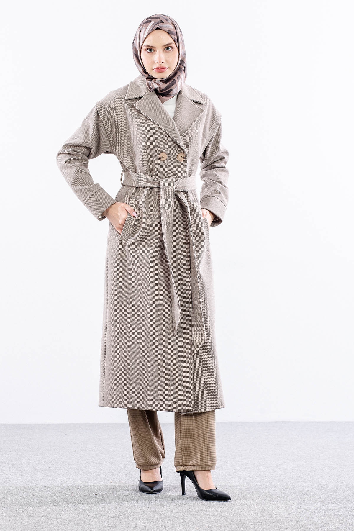 F-1595 Kaşe Kaban 38-48 Takma Kol Balıksırtı - K_kahve - 1